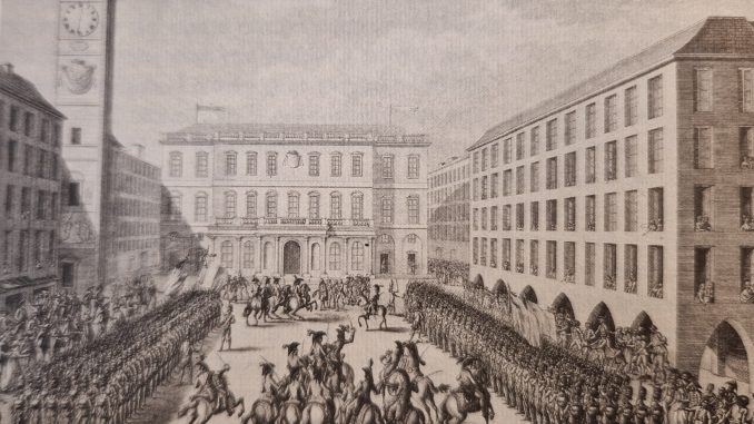 L'esercito rivoluzionario francese di fronte a Palazzo Civico, incisione in rame dell'anno 1800 (Archivio Storico Città di Torino)