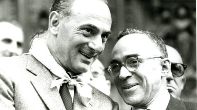 Da sinistra Enrico Mattei con il sindaco di Firenze Giorgio La Pira. Foto Wikimedia Commons