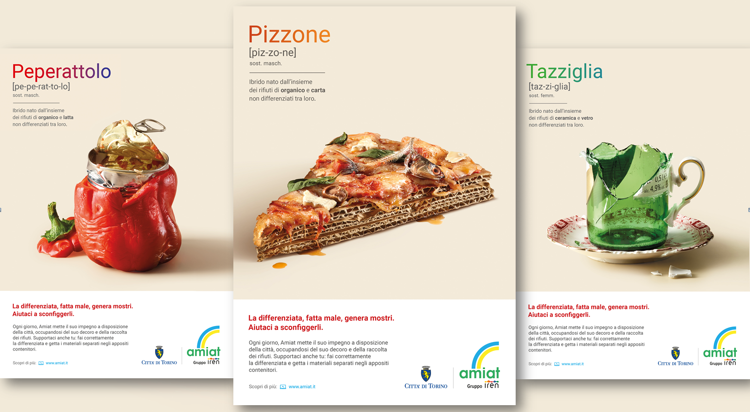 Peperattolo, pizzone e sono i protagonisti della nuova campagna informativa di Amiat: “la differenziata, fatta male, genera mostri” che, da oggi, cercherà di comunicare ai torinesi le modalità corrette per smaltire i #rifiuti. Nomi di fantasia per descrivere prodotti anomali che nascono dalla fusione fra peperone e barattolo, fra pizza e cartone, fra tazzina e bottiglia, rappresentativi degli errori più comuni che vengono fatti in fase di #smaltimento. Il messaggio è chiaro: i rifiuti vanno smaltiti in modo corretto, senza mescolarli ma utilizzando, nelle modalità indicate, i contenitori per la raccolta differenziata. La nuova campagna informativa è stata presentata questa mattina presso l’Urban center di piazza Palazzo di Città dall’assessora Chiara Foglietta , presenti i rappresentanti dell’azienda e i consiglieri comunali della Sesta e della Seconda commissione. Da oggi, l’iniziativa realizzata in collaborazione con la Città, fa bella mostra di se, su tutti i cartelloni pubblicitari della città.