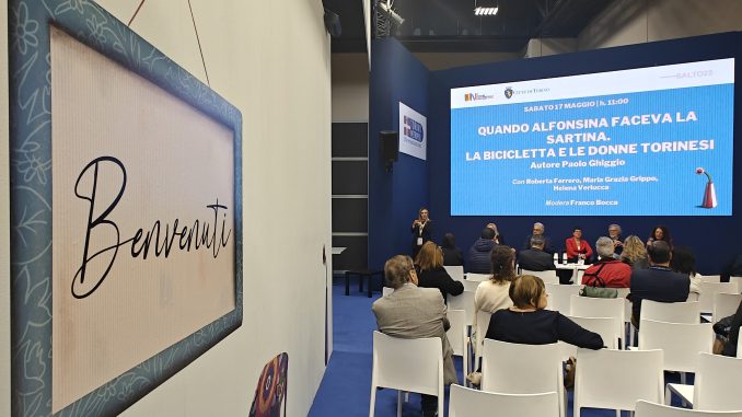 Mentre su e giù per la Penisola, in occasione dell’edizione numero 108 del Giro d’Italia, si rincorrono i professionisti del pedale, lo stand della Città di Torino al Salone Internazionale del Libro ha ospitato un incontro su #ciclismo ed #emancipazione femminile. Organizzato dalla presidente del Consiglio comunale Maria Grazia Grippo, il dibattito è stato moderato dal giornalista Franco Bocca, dopo la presentazione del libro dello scrittore Paolo Ghiggio “Quando Alfonsina faceva la sartina. La bicicletta e le donne torinesi”. Erano presenti anche Helena Verlucca della Casa editrice Hever e la campionessa del pedale Roberta Ferrero.