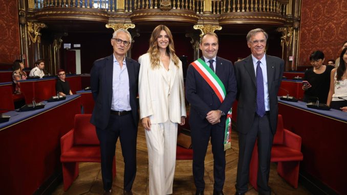 La nuova Ambasciatrice di Torino nel mondo Cristina Chiabotto con il sindaco Stefano Lo Russo e la vicepresidente del Consiglio comunale Ludovica Cioria