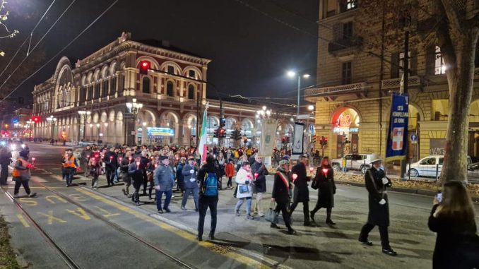 Stazione di Porta Nuova. Di qui partivano i vagoni piombati che portavano ebrei e prigionieri politici verso i lager nazisti. Questa sera, su iniziativa dell’Associazione Nessun Uomo è un’Isola, rappresentanti delle istituzioni e almeno trecento torinesi, tra i quali molti giovani, si sono riuniti avanti alla targa che commemora quei tragici eventi. Un omaggio alle vittime del totalitarismo nazifascista e un impegno collettivo a non permettere che si affermino oblio e indifferenza, terreno di coltura per nuovi orrori. Un corteo, alla luce delle fiaccole, ha raggiunto le ex Carceri Nuove, percorrendo a ritroso l’itinerario di dolore di tanti uomini e donne trasportati dalle celle a quei vagoni piombati diretti verso la morte.