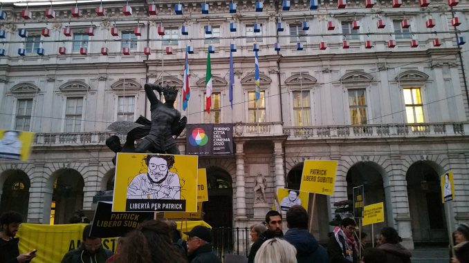 Con cartelli e slogan chiedevano la liberazione di Patrick Zaky il ricercatore egiziano arrestato due settimane fa e torturato in una prigione a Il Cairo.