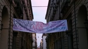 Quasi in concomitanza, si è svolta una seconda manifestazione da parte dei Rider che, con uno striscione appeso all’imbocco di via Palazzo di Città, chiedono che siano le aziende a farsi carico dei costi legati alla sicurezza.