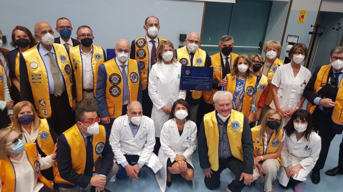 Rappresentanti dei Lions Club e personale sanitario dell'OIRM in posa con la targa a ricordo dell'iniziativa benefica