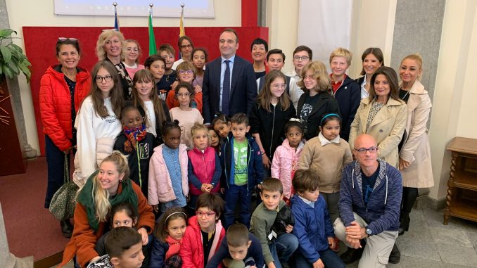 Con la presidente del Consiglio Comunale, Maria Grazia Grippo e il sindaco, Stefano Lo Russo, bambine e bambini e loro insegnanti della scuola Pacchiotti