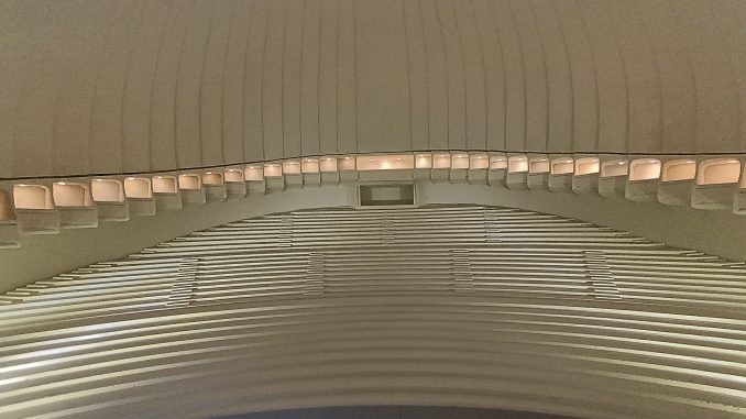 A partire proprio dal Teatro Regio, una struttura che, sulla pianta, così come da veduta aerea, ricorda un corpo di donna. E’ l’unico teatro al mondo concepito con un foyer verticale, con un sistema di illuminazione della sala costituito da 4000 prismi che diffondono la luce proveniente da fonte laterale.In mostra, il modello in gesso del teatro con platea, palchetti e cupola progettato nel 1966 per i test di risonanza, in un ambiente simile alla forma di un uovo.