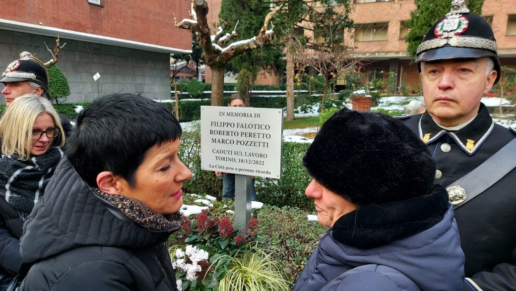 Di fronte a una folle silenziosa e commossa, Maria Grazia Grippo, presidente del Consiglio Comunale e della Commissione Toponomastica della Città di Torino, ha espresso il cordoglio dell’intera comunità torinese e ha ringraziato consigliere e consiglieri comunali per avere votato all’unanimità la proposta di apposizione della targa. Ha quindi ricordato che il lavoro dovrebbe servire per vivere, e a lungo, non per morire.