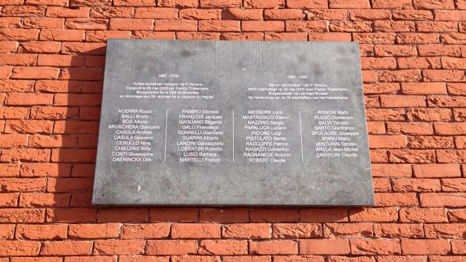 La targa in francese e fiammingo in memoria delle 39 vittime, a Bruxelles