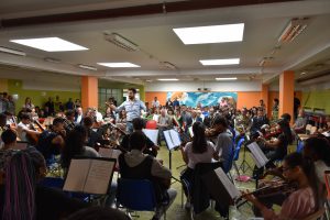 A far da cornice, studenti e studentesse che hanno intonato “Bella ciao”, accompagnati alla chitarra e al violino dai loro insegnanti di musica.