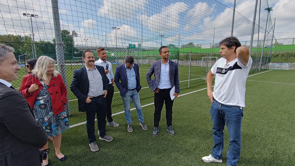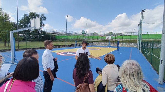 Walter Galliano mostra alla Commissione il campo di volley e basket donato alla Nida