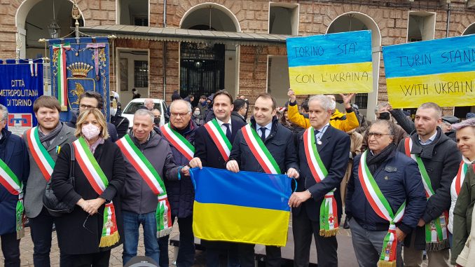 Sindaci e sindache, assessori e assessore, consiglieri e consigliere della Città di Torino e di varie municipalità della Città metropolitana di Torino si sono ritrovati questa mattina di fronte alla Prefettura, in adesione all’iniziativa di #Eurocities in solidarietà con l’#Ucraina. Presenti anche delegazioni sindacali e cittadini, compresi diversi ucraini e ucraine residenti a Torino e provincia.