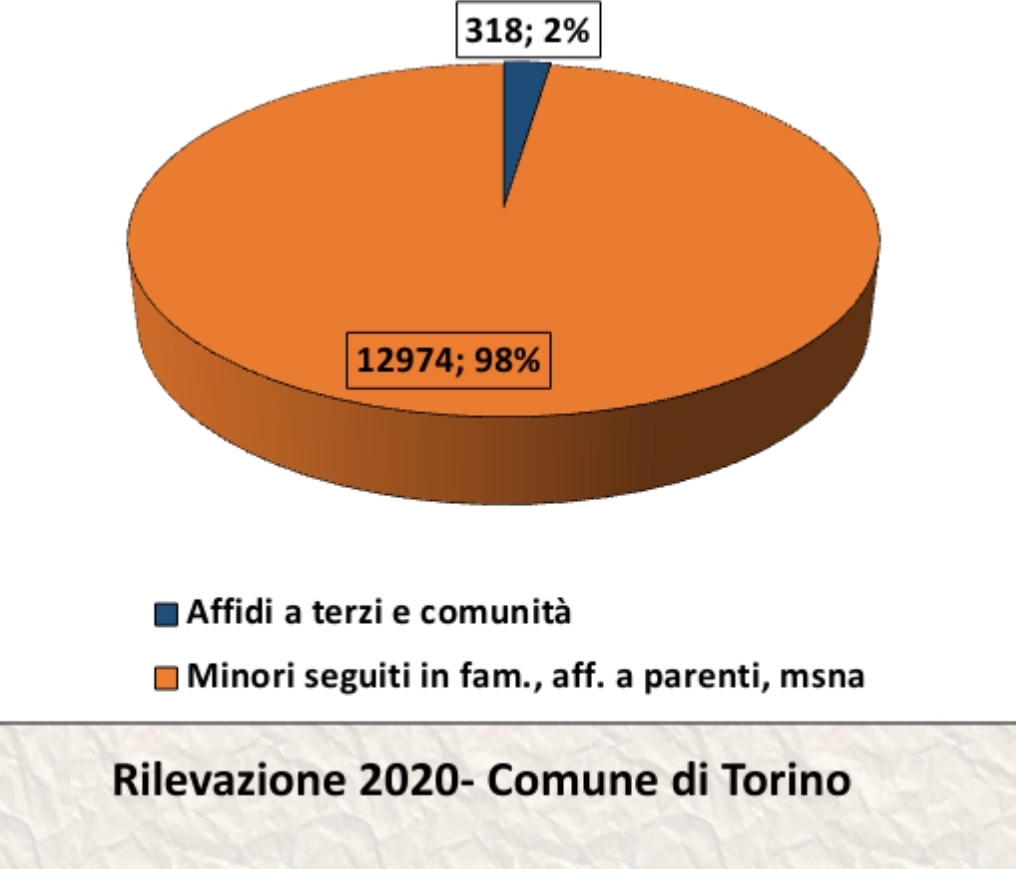 E’ stato sottolineato come a Torino i minori in difficoltà seguiti dal Comune, in famiglia o nella sfera familiare, siano il 98%, pari a 12.974. Solo il 2%, quindi, corrispondente a 318 minori, è affidato ad altre famiglie o a comunità.