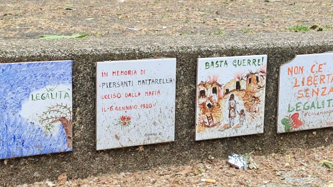 Le piastrelle della legaità al giardino Peppino Impastato, collocate negli anni scorsi