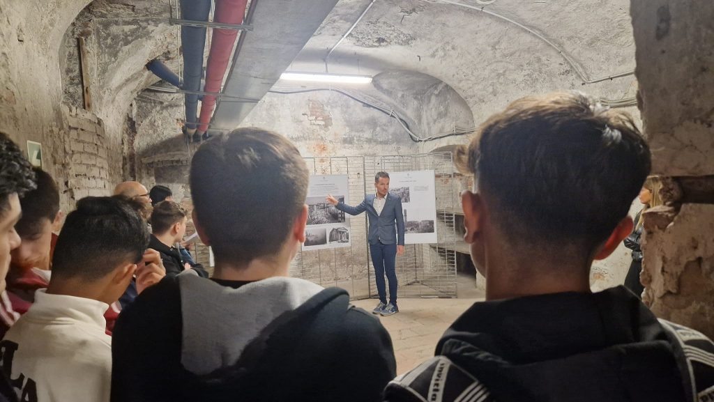 Il rifugio antiaereo di Palazzo Civico è stato oggi visitato da un gruppo di insegnanti e studenti della classe 5a D (indirizzo tecnico elettronico) dell’Istituto Primo Levi, accolti nel Cortile d’onore dalla presidente del Consiglio comunale Maria Grazia Grippo.