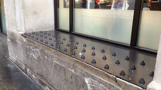 Nella fotografia: esempio di architettura ostile. Spuntoni anti-senzatetto che impediscono alle persone di sedersi (immagine Wikipedia).