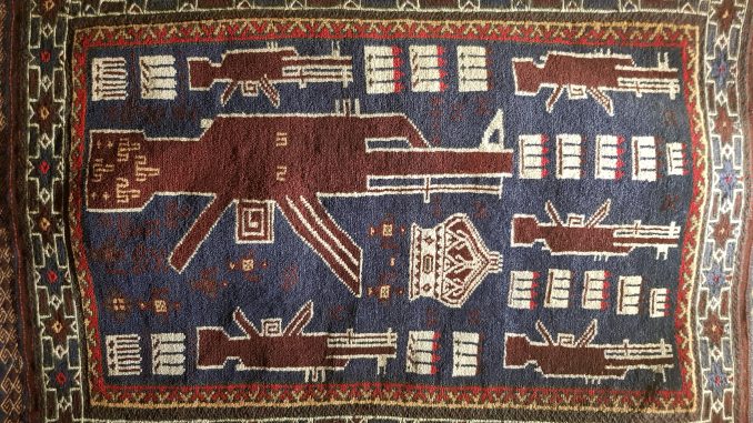 Un tappeto afghano raffigura dei fucili d'assalto AK 47 , più conosciuti come "Kalashnikov" dal nome del loro realizzatore