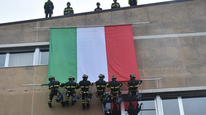 Prima della cerimonia religiosa, autorità, pompieri e loro familiari hanno assistito all’omaggio ai caduti, con la deposizione di una corona da parte del Prefetto e del Comandante provinciale dei Vigili del Fuoco e allo srolotamento del Tricolore da parte di una unità acrobatica che si è calata dal tetto di un edificio all’interno della caserma.