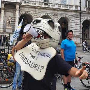 Tra i manifestanti, l’artista Piero Gilardi, autore delle maschere riproducenti il teschio di un dinosauro indossate da alcuni ragazzi e ragazze, a simboleggiare il rischio di estinzione per la specie umana.