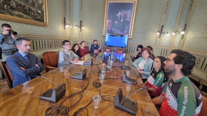 Questa mattina, presso la Sala delle Congregazioni di Palazzo Civico, la presidente del Consiglio comunale Maria Grazia Grippo, insieme a un gruppo di consiglieri e consigliere, ha ricevuto due esponenti dell’associazione Solidarity Rising, accompagnati da una rappresentanza del coordinamento per la pace AGiTe.