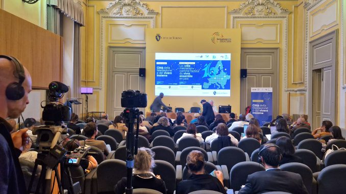Concetto caro a tutte o quasi le culture, etnie e religioni, la pace non è semplicemente assenza di conflitto armato, ma è la capacità di vivere insieme, preservando le diversità  pur alimentandone l’incontro, il dialogo reciproco, il mutuo rispetto di regole comuni, funzionali al vivere in pace con uguali diritti e doveri in seno a una comunità condivisa. Sono le città, luoghi nei quali il genere umano più si concentra con tutte le sue peculiarità e contraddizioni, il terreno dove gli equilibri possono essere più fragili. Al tempo stesso, però, rappresentano anche una concentrazione di energie, risorse, intelligenze e opportunità: un luogo per eccellenza di incontro e di mediazione. “Città della mediazione e del vivere insieme” è infatti il programmatico titolo dell’incontro europeo svoltosi oggi nella sala “Norberto Bobbio” dello storico edificio della Curia Maxima, una delle sedi auliche della Città di Torino, che ha patrocinato l’iniziativa insieme all’Agenzia delle Nazioni Unite per i Rifugiati (UNHCR), rappresentata da Massimo Gnone.