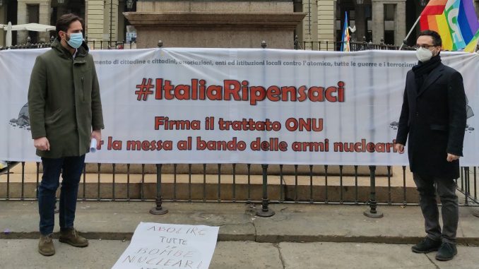 Convocato dalla rete “Italia ripensaci”, questa mattina davanti a Palazzo Civico si è svolto un sit-in per ricordare l’entrata in vigore del Trattato per la proibizione delle armi nucleari (TPNW) e sollecitare #Governo e #Parlamento del nostro Paese alla firma del trattato. L’Italia, infatti, nonostante abbia partecipato alla conferenza delle Nazioni Unite del 2017 che ha redatto il documento, non è fra gli oltre cinquanta Paesi che l’hanno sottoscritto. Il TPNW proibisce specificamente l’uso, lo sviluppo, i test, la produzione, la fabbricazione, l’acquisizione, il possesso, l’immagazzinamento, il trasferimento, l’installazione o il dispiegamento di armi nucleari. I Paesi che hanno partecipato alla conferenza del 2017 sono stati 129 oltre a 7 organizzazioni internazionali quali l’Unione Europea e la Croce Rossa Internazionale, oltre a numerose organizzazioni non governative. Alla votazione finale del trattato, il 7 luglio 2017, hanno partecipato 124 paesi, con 122 voti a favore, un voto di astensione (Singapore) e un voto contrario (Olanda). La manifestazione di oggi, alla quale hanno partecipato in rappresentanza del Consiglio comunale il presidente Francesco Sicari e il vicepresidente vicario Enzo Lavolta, replicata in diverse città italiane, aveva anche lo scopo di ricordare che l’Italia può ancora apporre la propria firma a ratifica del trattato. Un’adesione necessaria per Sicari, che rilancia: “E’ necessario mettere la parola fine a questa incresciosa situazione che vede il nostro Paese non ancora schierato dalla parte di coloro che chiedono il definitivo ripudio delle armi nucleari“. “Il rammarico maggiore – gli fa eco Lavolta – è vedere che il nostro Paese non ha ancora deciso quale ruolo e quale posizione assumere in questa storia. Noi abbiamo già deciso e siamo dalla parte giusta, quella che ha deciso, approvando all’unanimità in Consiglio comunale una mia mozione nel 2017, di stare dalla parte di chiede, propone e vuole il disarmo“.
